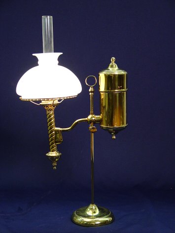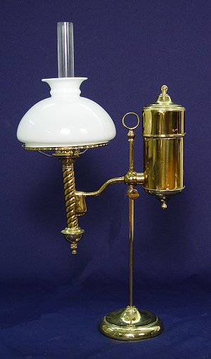 BRASS STUDENT LAMP: Oil lamp converted to electricity. White glass shade has a 7'' fitter rim. Weighted bottom. Minor dents in font. 21''h., 26'' overall with chimney.