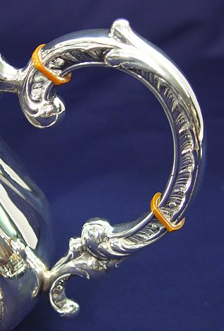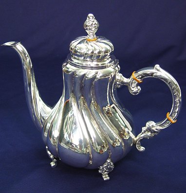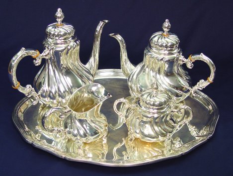 GERMAN HAND WROUGHT STERLING TEA SERVICE: 5 piece set to include the tray, (19 x 14 3/4''), coffee pot, tea pot, cream pitcher, and covered sugar. Swirled body and lids, the pot lids are hinged. Each piece, including the tray, is stamped ''Handarbeit 925 Sterling Silver'' and hallmarked with the German crescent moon and crown. No monograms. Approx. 97.51 oz.