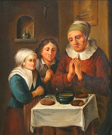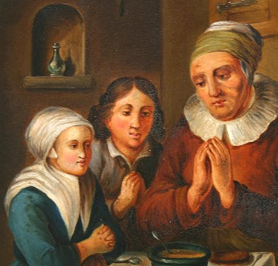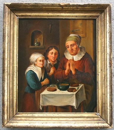 RARE DUTCH OLD MASTER OIL/TIN: Depicts a family praying in an interior before a mill, 7'' x 5 3/4'', no visible signature.