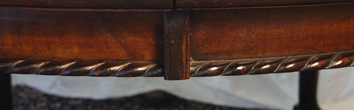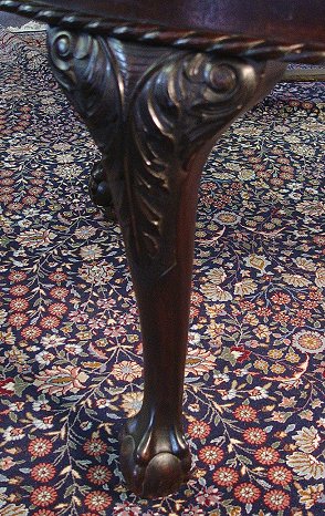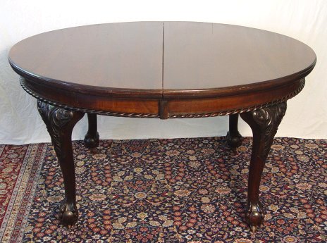 19TH C OVAL CHIPPENDALE STYLE DINING TABLE: Ornate gadrooned apron, ball and claw feet. Very heavy mahogany. Crank mechanism to table underside with many slides. Sold with 2 leaves however would probably accept 4 to 6 leaves. Missing crank. 55'' x 48''w x 29 1/2''. Leaves are 11 3/4'' each.