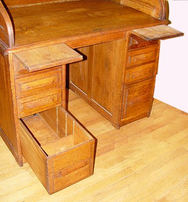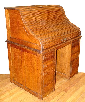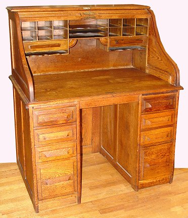 CUTLER GOLDEN OAK ROLL TOP DESK: In 1850, Abner Cutler, owner of the Cutler Desk Co. in Buffalo, New York, was the first American to patent the roll top desk that we know today. The curved tambour top became his standard and it has become a classic style that has endured for more than 145 years. This beautiful example features the ''S'' Roll tambour top, paneled sides, courtesy panel for the ladies, beautiful fitted interior with pencil trays and mail slots to the sides. A fine example in superior condition. The piece retains it's Cutler decal. 50''h x 42''w x 30 1/2''d. Est. $1200/1500**