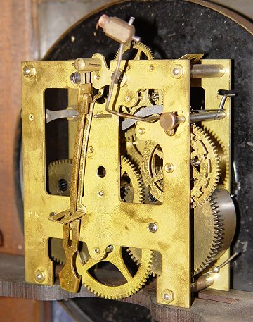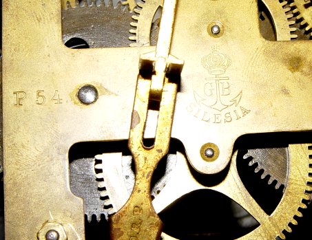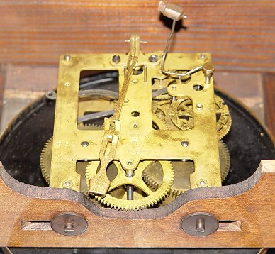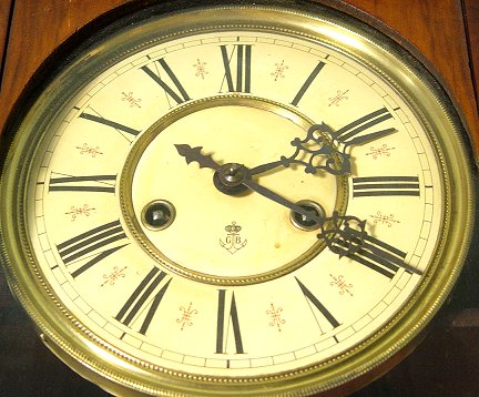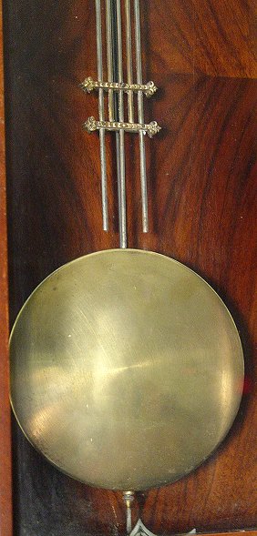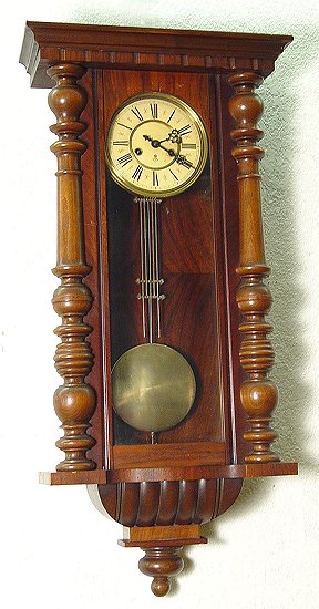 GUSTAV BECKER REGULATOR CLOCK: Walnut wall mount case. Brass pendulum, key wind striking movement. Signed in three places- the brass works, dial, and iron fitting on the case. Very good condition. 37''h. x 15 3/4'' x 6 1/2''.