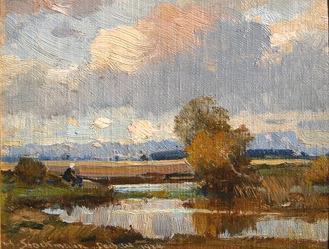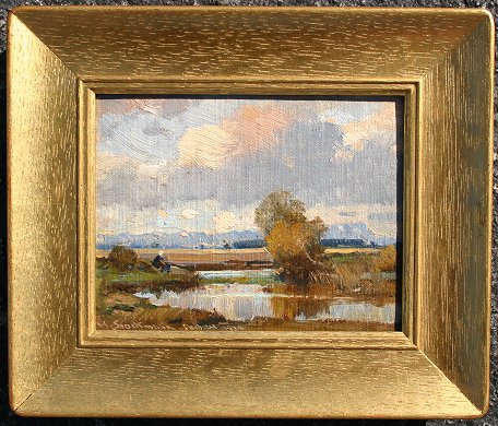STOCKMANN, Hermann, (German, 1867-1938): Landscape with figure, O/C/B, 4 1/2'' x 6'', signed lower left and dated 1934, Dachau, encased in gilded oak frame. Est. $1500/2500**