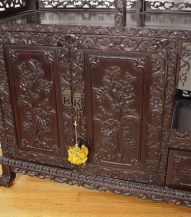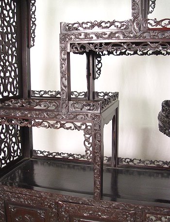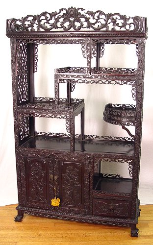 EARLY 20TH C CHINESE EXPORT CARVED ROSEWOOD DISPLAY CABINET / ETAGERE: Filagree carvings frame the open shelving display with lower section having hidden storage. , 60''h x 42'' x 15''