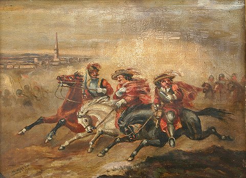 EUROPEAN OIL/TIN OF A CALVARY SKIRMISH: 19th, possibly 18th century, 12'' x 16'', indestinctly signed lower left. Condition - Needs cleaning, some older restoration visible, a true antigue.