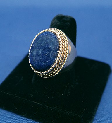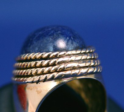 MAGNIFICENT LAPIS LAZULI AND GOLD RING: Large oval cabochon of lapis lazuli, approx. 3/4'' x 1 /2'', set in rope motif mount of 14k yellow gold, size 7.5, 12.8 grams. Est. $700/900**