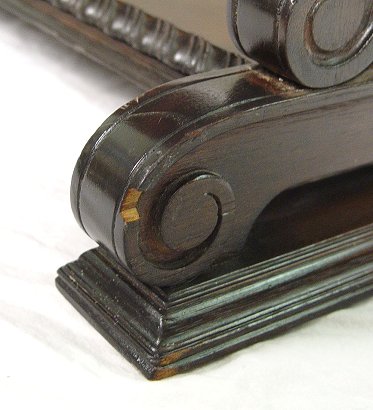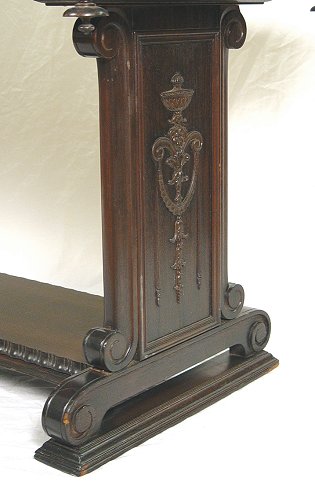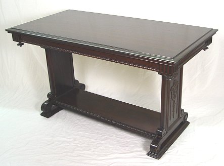 EARLY 20TH C MAHOGANY LIBRARY TABLE: Two half length drawers. Solid stretcher lower tier. Carvings to the side legs. 29 1/2''h. x 28'' x 53''.