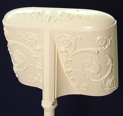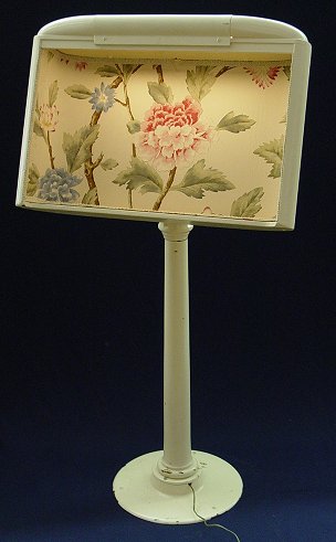 HIGHLY ORNATE ILLUMINATED MUSICIANS STAND: Painted mahogany, can be used as a menu board or welcome placard. Iron base. 50''h.
