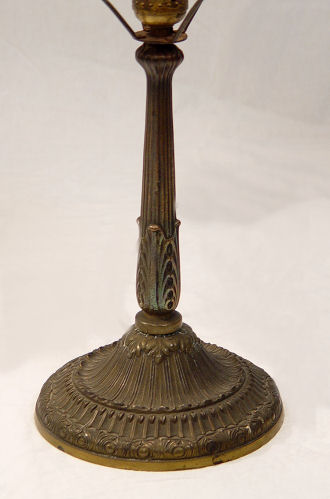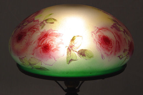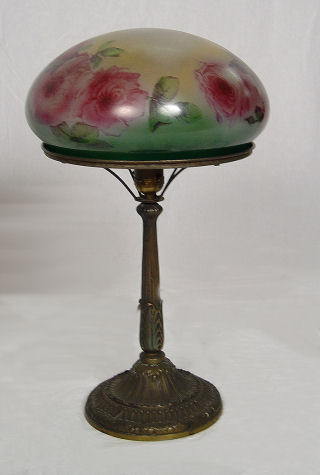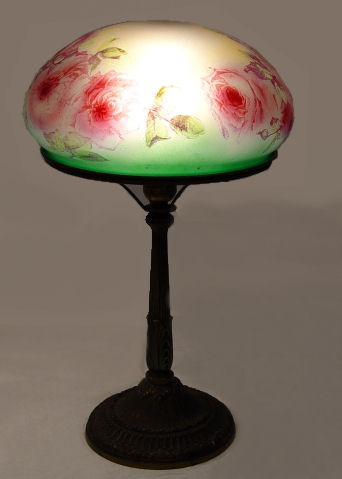 VINTAGE 1930's PITTSBURGH ROSE DECORATED TABLE LAMP: The base is signed PLB & Co 1809. The domed glass shade is decorated in a vibrant rose decor. Shade is 10'' dia., lamp is 19 1/2''h.