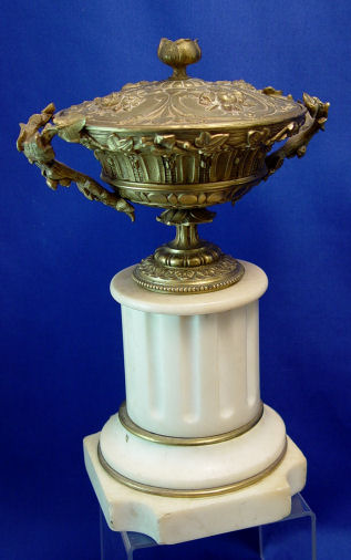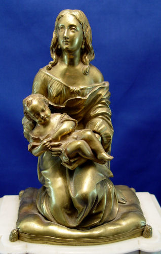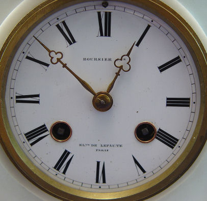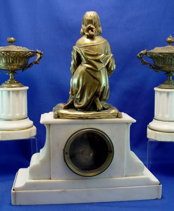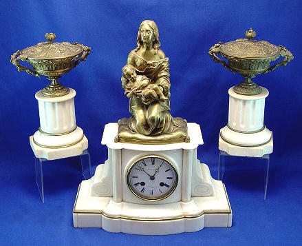 BOURSIER JAPY FRERES BRONZE & MARBLE CLOCK GARNITURE: Marble case surmounted by bronze figure of mother and child signed Faillot (Edme-Nicolas Faillot (1810 - 1849) FRENCH). The 3 1/2'' enamel dial is signed Boursier. Clock measures 16'' x 12 3/4'' x 6'' overall, the bronze is 9''h. Covered urns are 10''h.