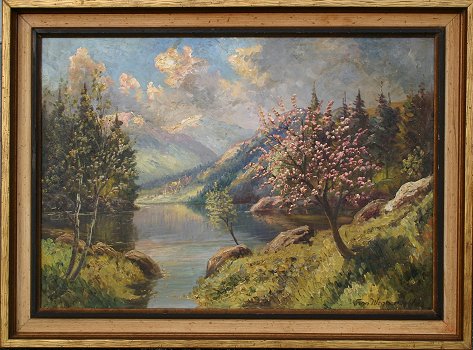 WENNERWOLD, Finn, (Danish, 1896-?): Lakeside landscape, O/C, 26 1/2'' x 38 1/4'', signed lower right, encased in a worn accented frame, 33 1/4'' x 45''.