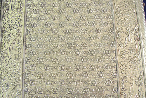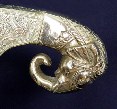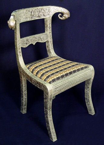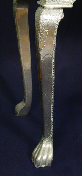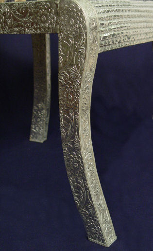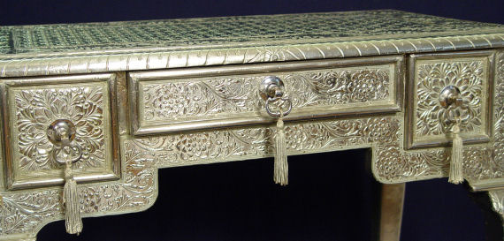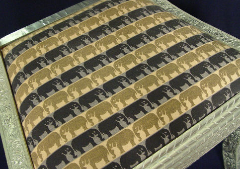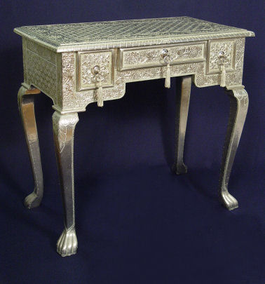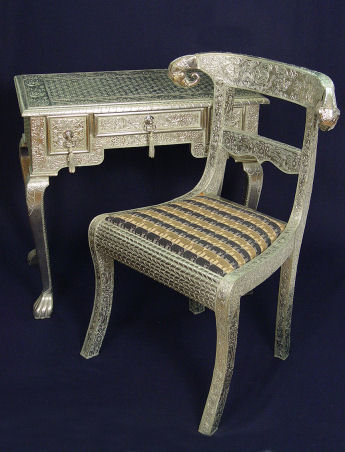 DECORATIVE SILVER CLAD WRITING DESK WITH CHAIR: The chair top rail ends in elephant heads, elephants adorn the seat fabric. Desk is Queen Anne Style, two drawers, paw feet, 28''h. x 30''w.