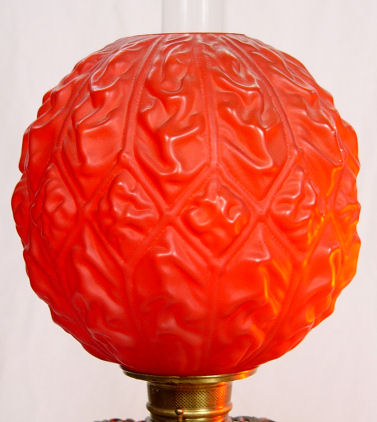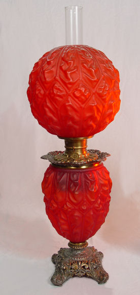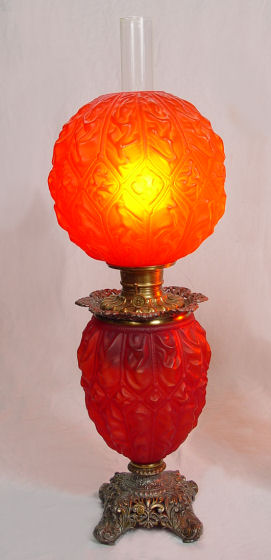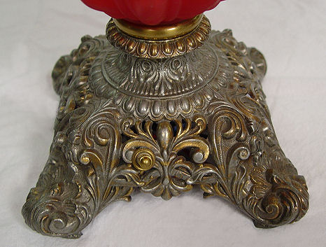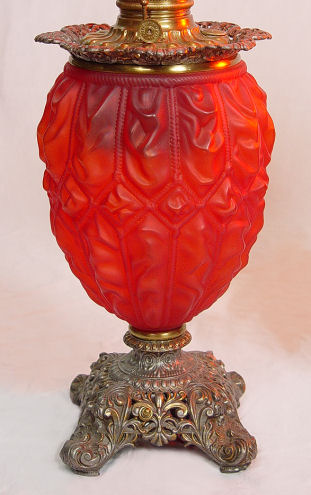 RED SATIN GLASS GONE WITH THE WIND LAMP: Pierced metal base. 28''h without chimney. Electrified, Please note repair to shade.