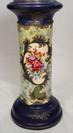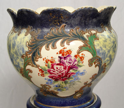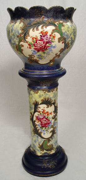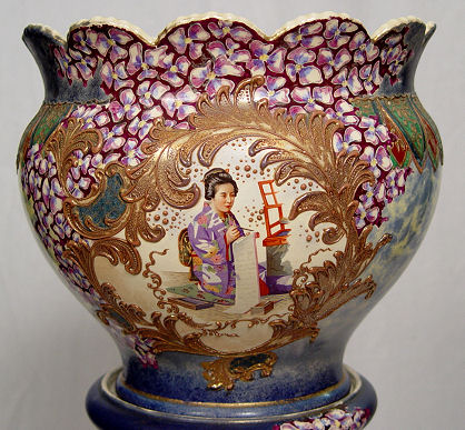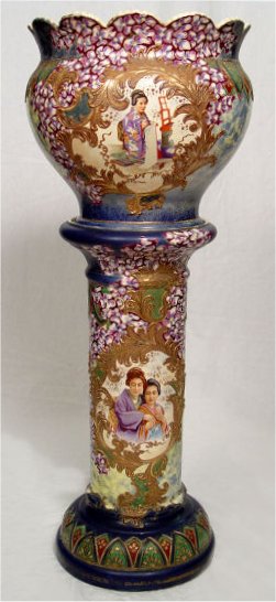 EARLIER 20TH C EARTHENWARE JARDINERE & STAND: Highly decorated in the Satsuma tradition, showing images of Geisha. The stand is 18''h, the jar is 10''h. Unmarked. Est. $400/600**