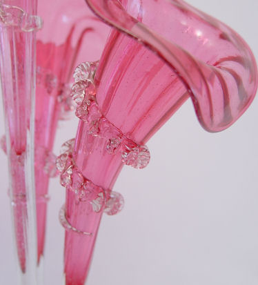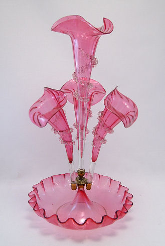 CRANBERRY GLASS EPERGNE: Applied ruffle to each of the four trumpet vases. 19''h, the center bowl is 10 1/2'' dia.