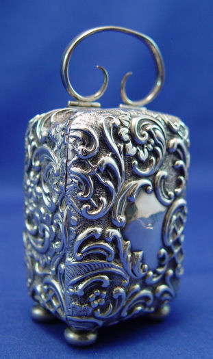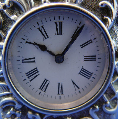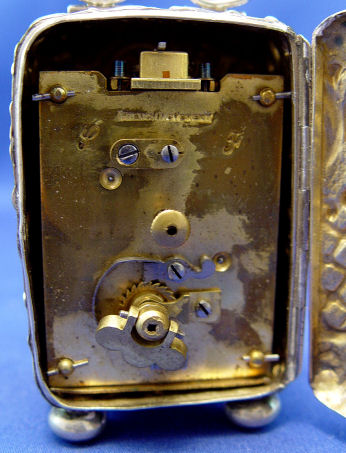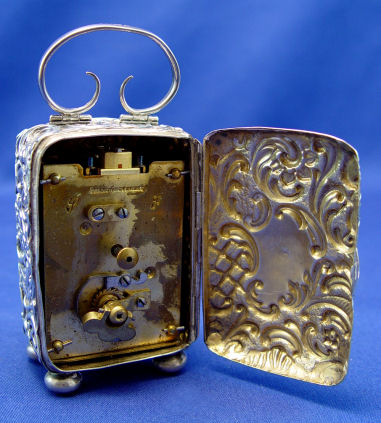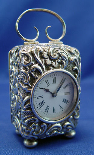 ENGLISH SILVER REPOUSSE CARRIAGE CLOCK: French movement. Hallmarks indicate maker H W Ld, Birmingham, Ca 1901. 4''h. including handle. Lion and date litter hallmarks are visible, the others are worn.