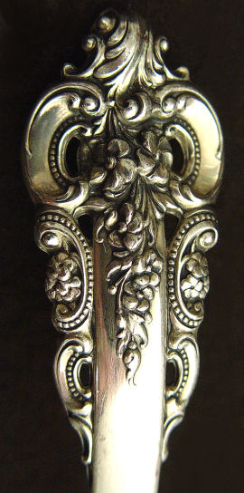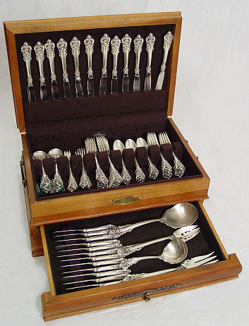 GRANDE BAROQUE STERLING FLATWARE SERVICE FOR 12 BY WALLACE: To include 12 each of dinner knives (9''), dinner forks (7 1/2''), salad forks, soup spoons, butter knives, teaspoons, and 8 cocktail forks, a meat fork (9 1/2''), ladle (6 3/4''), casserole spoon (9 1/4''), and a slotted serving spoon (8 3/4''). Sold with a fine cherry storage box.