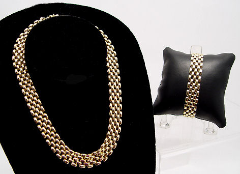 14K YELLOW ITALIAN GOLD NECKLACE AND BRACELET: I believe these are of the Bismark link, each marked 14K Italy DG. The necklace is 16''l. and approx. 12mm wide, the bracelet is 7''l. and of a matching width. Approx. 63grams total.