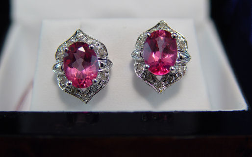 2.5CTW PINK TOPAZ & DIAMOND EARRINGS: Oval cut topaz in a vibrant pink, approx. 1.5cts each set in 14k white gold post earrings and surrounded a row of tiny diamonds. Sold with an appraisal stating Retail Replacement Cost of $1055.00.