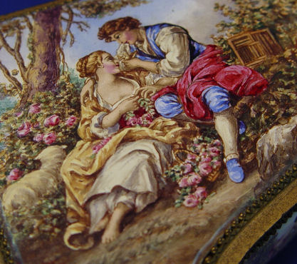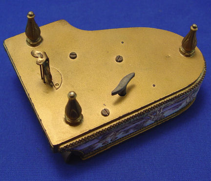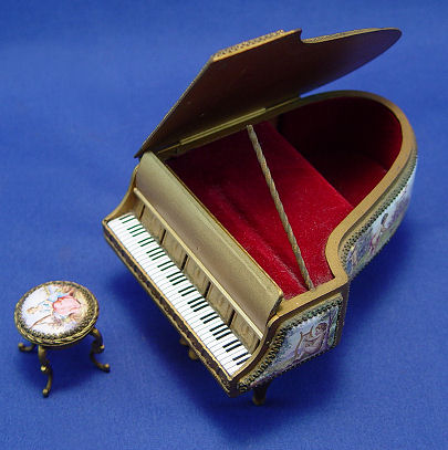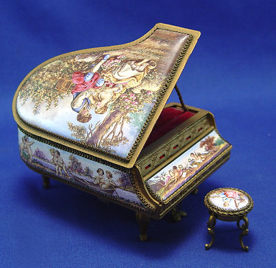 VIENNESE ENAMEL PIANO MUSIC BOX: Artist signed T. Wiuter, the panels are detailed scenes of putti and cherubs at play featuring the largest panel being a love scene in a rose garden. The mechanism is Swiss made Reuge. 2 3/4''h, the piano is 5 1/2''l. Stool included, 1 1/2''h.
