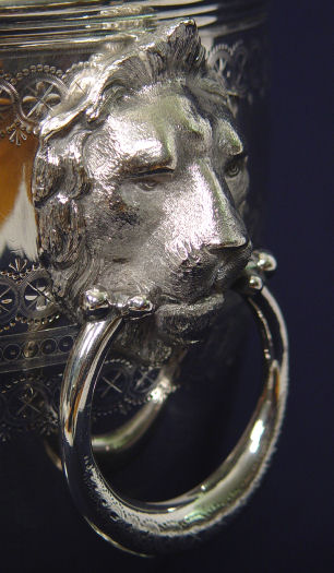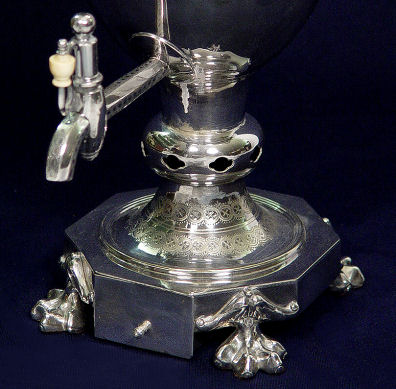 A SUBSTANTIAL SILVERPLATED SAMOVAR OR COFFEE URN: Featuring large ring nose lions head masqueron handles, a pull out drawer houses the burner, fabulous paw feet. There is no makers mark. 22''h, 9''w.