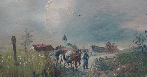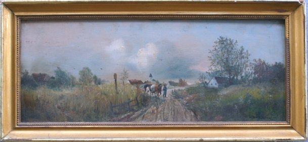 BURGER, Lothar, (Austrian, 1866-1943): Traveling along the path, O/Wood Panel, 6'' x 16 1/2'', signed lower right, encased in period worn gilt frame with missing gesso, 8'' x 17 1/2''.