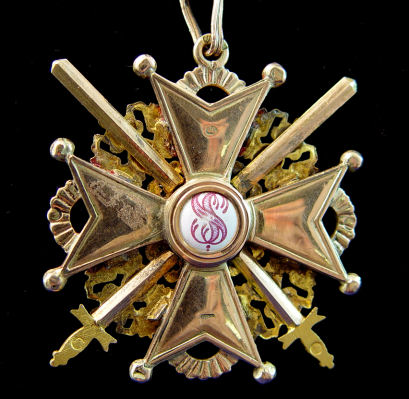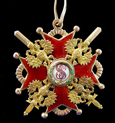 RUSSIAN ENAMELED GOLD MEDAL ORDER OF SAINT STANISLAIVS: 14k Gold (stamped 56), wgt.16 DWT, 25 grams, approx. 2 1/2'' square. Made in St. Petersburg, Russia, ca 1908. Stamped Edvard in Cyrillic.