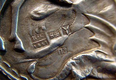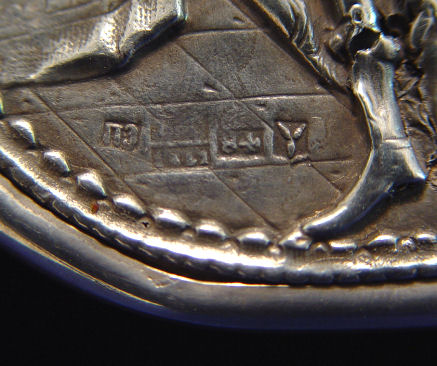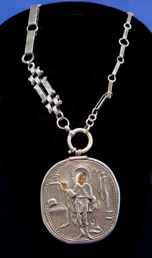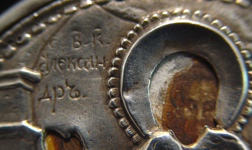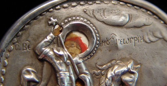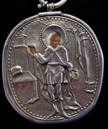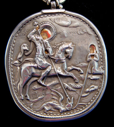 RUSSIAN SILVER ALL HOLY PANAGIA PENDANT: Dated 1851. With hand painted image of St. George on one side and St. Alexander Nevsky on the other. Hallmarked with 84 fineness, assayer KC, the three fishes denoting Saratov, Russia. Sold with the 26'' niello chain. Pendant is a 2 3/4'' oval.