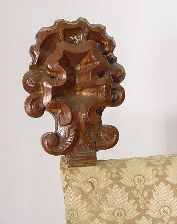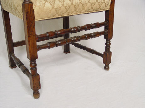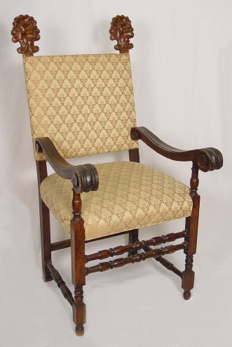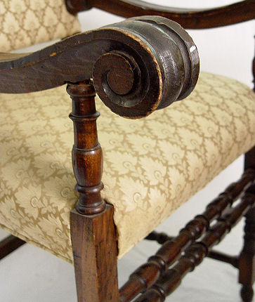 19th C ENGLISH OPEN ARM CHAIR: Masculine scroll curved arms, turned stretchers, the finials have remains of a paint type finish. 51''h. overall, 27'' x 26''.