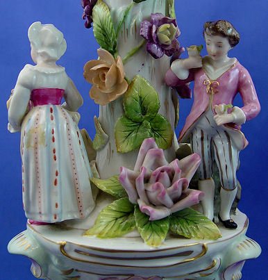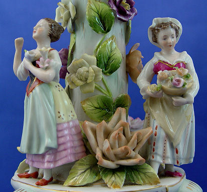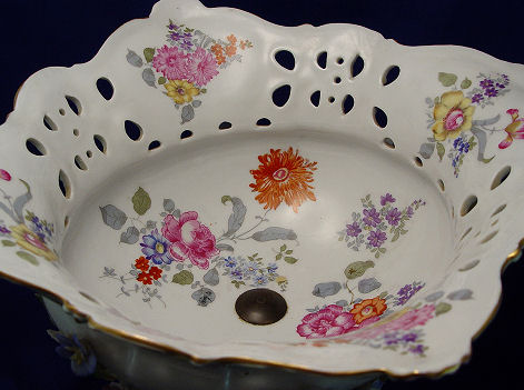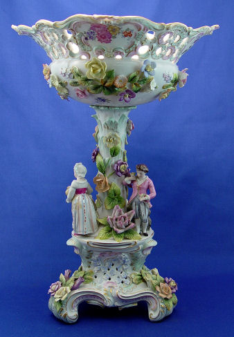 ELABORATE FIGURAL PEDESTAL CENTERPIECE: Applied floral and figures, reticulated bowl sits on pedestal and base with applied flowers and figures. Please call for condition.