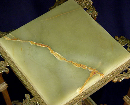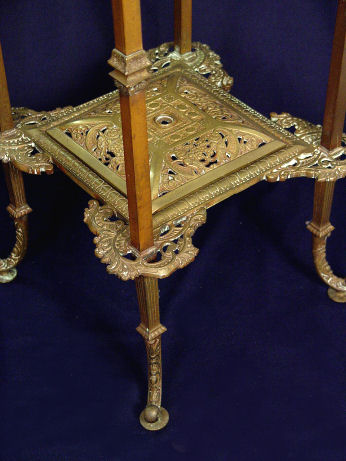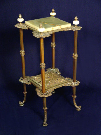 VICTORIAN MARBLE TOP FERN STAND WITH FINIALS: Green marble top, filigree metal work. 32 1/2''h, top marble is 10'' square.
