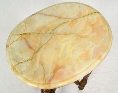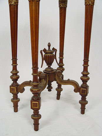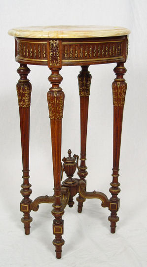 FRENCH LOUIS XVI MARBLE TOP LAMP TABLE: Uusually ornate in its tapered and shaped fluted legs and stepped cross stretcher with urn. Gold enhancements. 29 1/2'' h x 16 1/2'' oval top.