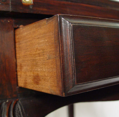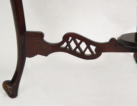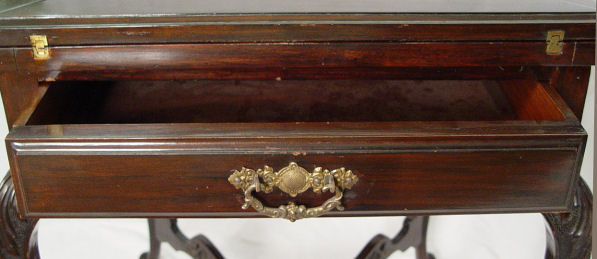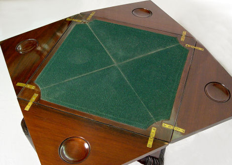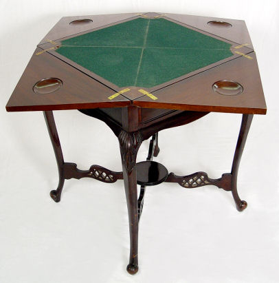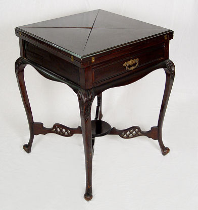 ENVELOPE CARD TABLE, CA 1890: Mechanical table, leaf pops up as top is rotated for access to felt lined writing surface. Pierced cross stretcher. 29'' h. x 21 3/4'' square.