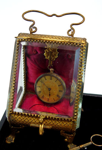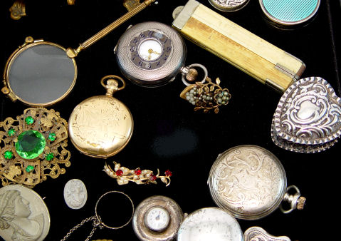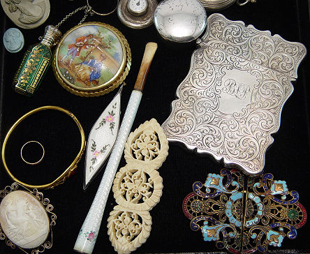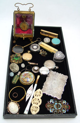 LOT OF ESTATE OBJECTS DE VIRTUE: English silver patch boxes marks indicate Birmingham 1900, 1901, 1906, 1918; ivory pocket ruler; small oval case of ivory? holding a silver spoon; English silver card case monogrammed BLP, marks indicate Chester 1902/03; bone pin; enamel buckle; Webster silver and enamel lace bobbin; unmarked enamel cigarette holder; Limoges scenic porcelain brooch; baby ring and bracelet; soft shell cameo; hard stone deeply carved cameo framed in silver pin and two smaller cameos; green glass with gold paint and silver cap vinaigrette scent bottle; lorgnette; pocket watches to include, English silver button hole watch, German? silver marked with standing bear .935, US Sterling SunDial watch, key wind in 14k gold case currently displayed in beveled glass stand; etc. Please note late addition of a gold thimble, size 11, etched in little scenic panels, monogrammed B, unmarked but assays at 14k. Sold as a lot.