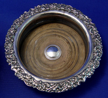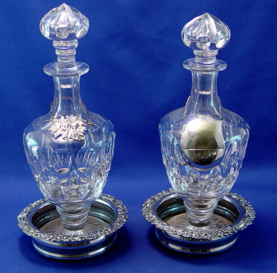 PAIR OF BACCARAT QUALITY CRYSTAL DECANTERS WITH SILVER COASTERS: Matched pair of cut crystal decanters, sold with a pair of silver wine coasters. No makers marks or touch marks to either. Bottles are 13''h, coaster, 6'' dia.