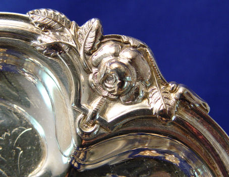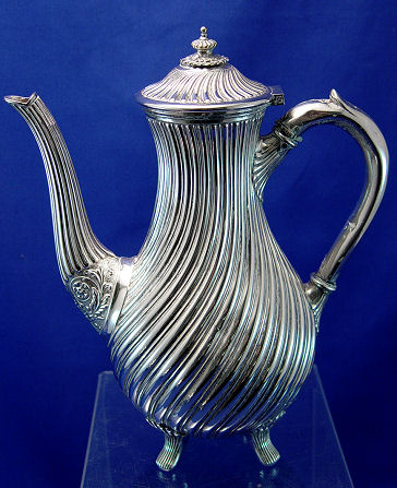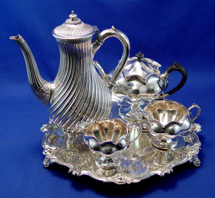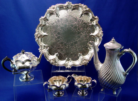 J. DIXON SHEFFIELD PLATE 3 PIECE TEA SET: Ebony handle teapot, open sugar and cream pitcher. Sold with a Victorian spiral 10'' tall coffee pot, also Dixon. The scallop rim footed tray is included. 12 1/2'' dia.
