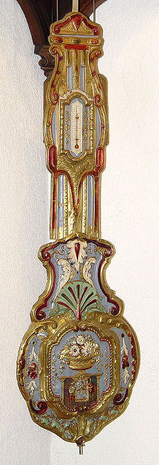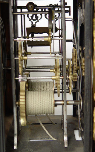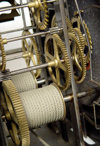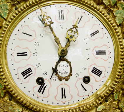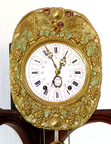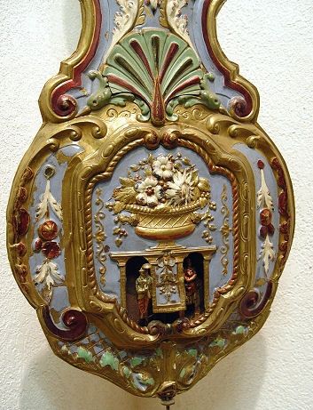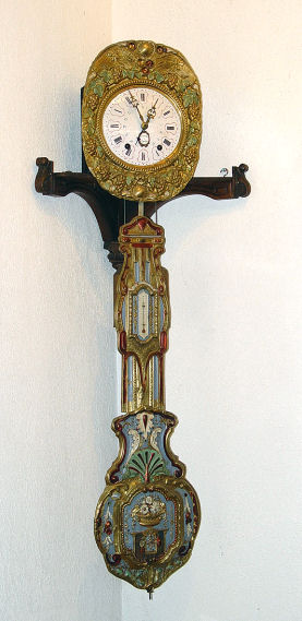 WAG ON THE WALL CLOCK and CORNER BRACKET: Grape motif embossed brass with decorative painted finish, mechanical figures in the pendulum. 57'' h. x 13'' at widest point of shelf. Front of clock is marked ''Esnos Argentan''.