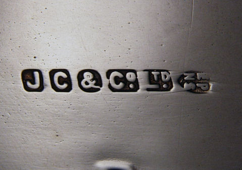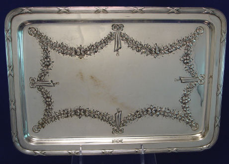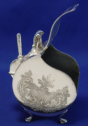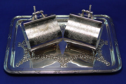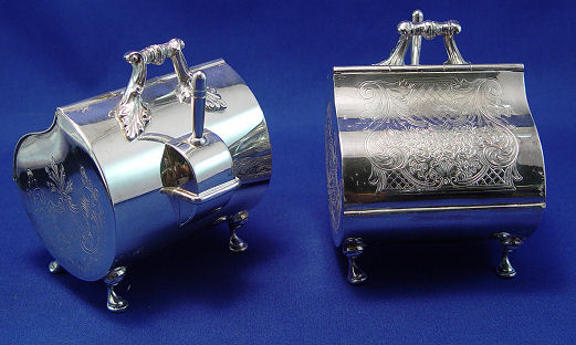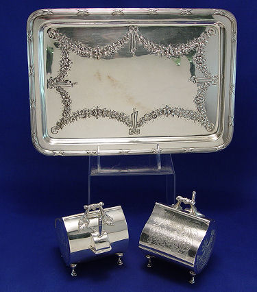 PAIR OF ENGLISH SILVERPLATE TEA OR SUGAR CANNISTERS, SCOOPS AND TRAY: The tea bins have hinged lids, the scoops conveniently on the side. The tray has embossed rose garland, made by JC & Co. 12'' x 9''.