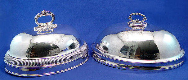 TWO SILVERPLATE MEAT DOMES: The beginning of a beautiful collection. Each is approx. 14''l. No makers marks.