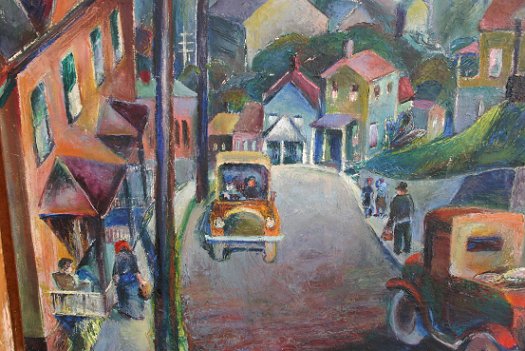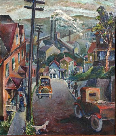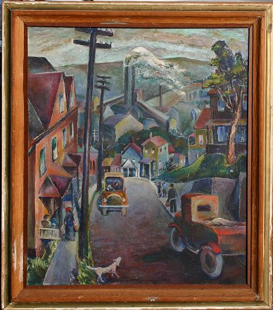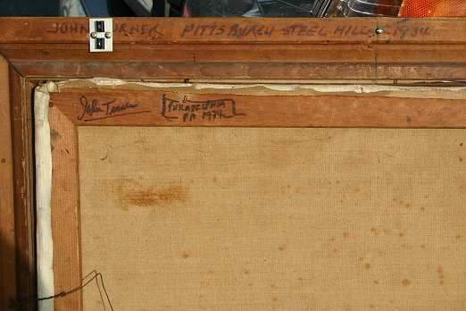 TURNER, John, (American, 20th C): ''Pittsburgh Steel Mills, 1934'', O/C, 36'' x 30'', original vintage frame, faint signature lower left, signed on the frame verso, well worn frame 42'' x 36 1/2''.