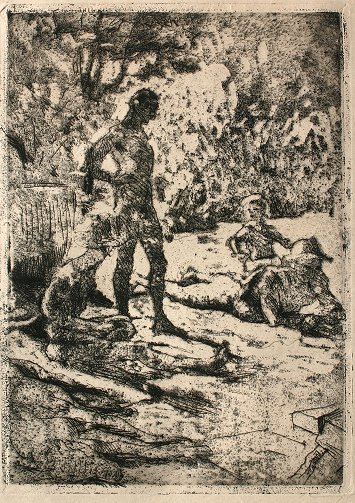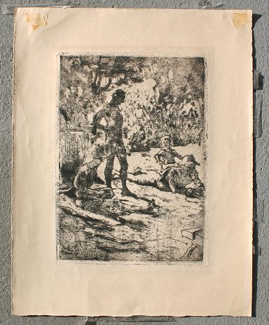 WPA ERA ETCHING DEPICTING FIGURES AT REST: Size with margins 15 1/2'' x 12 1/2'', faint pencil signature lower right, unframed.