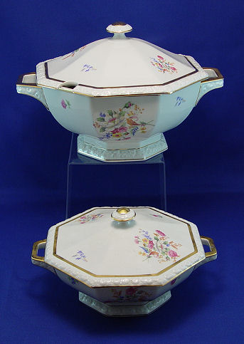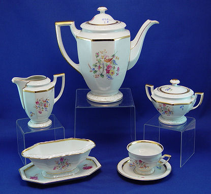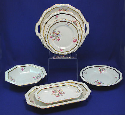 ROSENTHAL ''MARIA'' FINE CHINA SERVICE: 65 pieces to include 12 dinner plates 9 3/4'', 21 salad plates, 7 3/4'', 12 soup plate bowls 9 3/4'', 10 cups & saucers, covered vegetable, open vegetable bowl, 2 platters 9 1/2'' & 13'', 1 low bowl 9'' dia., cake plate, tureen, gravy, cream & sugar, and a coffee pot.
