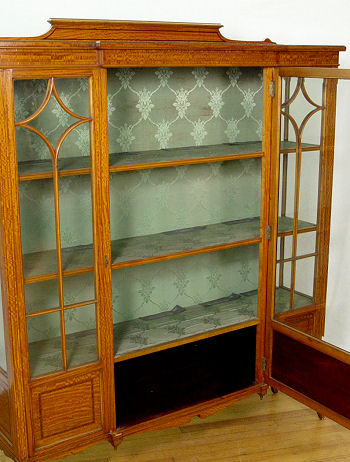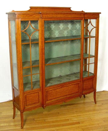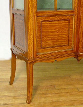HIGHLY FIGURED SATINWOOD DISPLAY CABINET: Early 2oth C string inlay display cabinet. Fabric lined interior. 62 1/2'' x 53 1/2'' x 14''