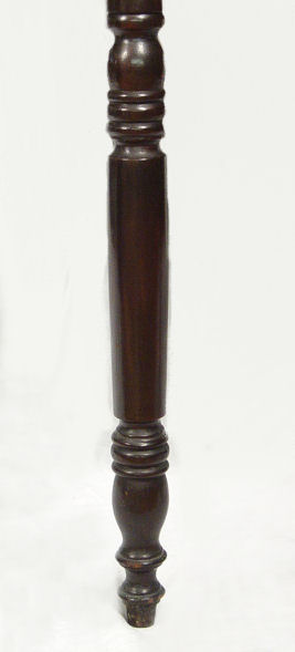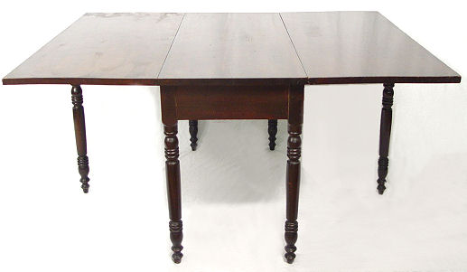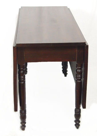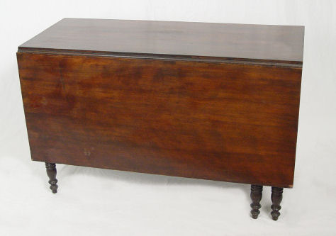 19TH CENTURY GATE LEG TABLE: 44'' X 18'' plus 19'' drops. Spool turned legs, single panel, soft wood.
