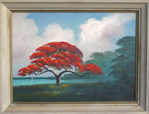 McLENDON, Roy A., (American,1938-): Florida landscape with Poinciana tree by the waters edge, O/Upson, 22'' x 29 3/4'', signed lower right, encased in a painted frame, 26 1/2'' x 34 1/2''.