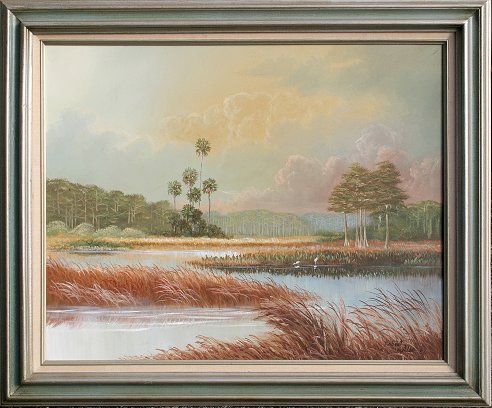 BUTLER, Robert, (American, 20th C): Florida Highwaymen tropical tidal marsh scene, O/C, 24'' x 30'', signed lower left and dated '82, vintage frame with minor wear, 36'' x 30''.