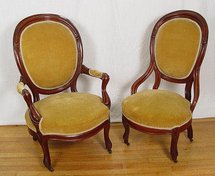 PAIR OF VICTORIAN BALLOON BACK PARLOR CHAIRS: Gold velvet upholstery to both gentleman's arm chair, 38 1/4''h. and lady's chair, 39 1/4''h.