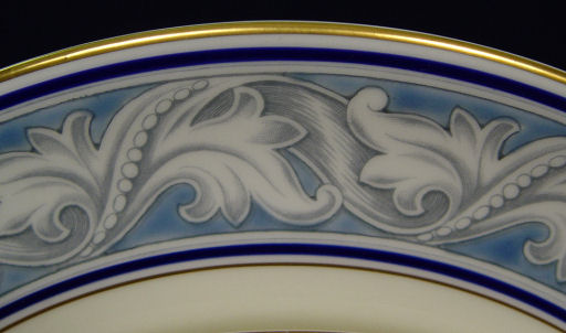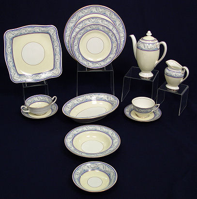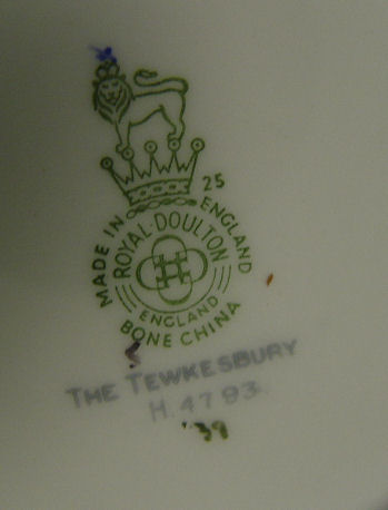 ROYAL DOULTON ''THE TEWKSBURY'' FINE CHINA: 69 pieces to include 8 dinner plates (10 1/2''), 6 luncheon plates, 8 salad plates, 8 bread plates, 12 dessert bowls, 7 soup bowls, 2 oval vegetable bowls, coffee pot, cream pitcher (chip on base), 5 cream soups and 9 tea cups share the 11 underplates, a demi-tasse cup and saucer and a cake plate.