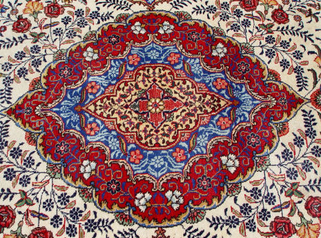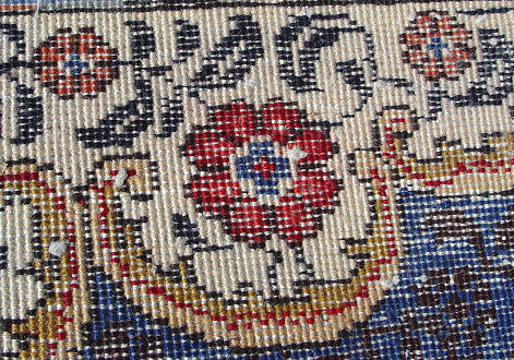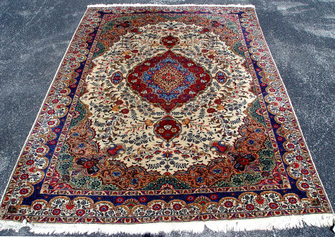 LARGE ORIENTAL CARPET: Vibrant center medallion on pale ground with floral design, wide outer border of dark blue, could use a good cleaning but seems in good condition, approx. 7'5'' x 10'8''.