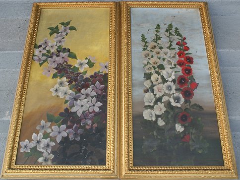 PR OF NAIVE 19TH C FLORAL STUDIES: Good quality depictions of violets and hollyhocks, /Cs, 40'' x 18'', both are unsigned, encased in period gilded frames with wear and repair. 44 1/2'' x 22 3/4''.